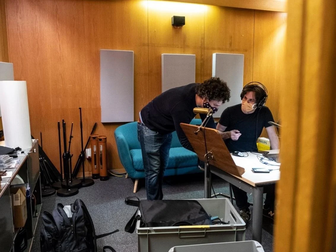 Small control room in a staircase at Konzerthaus Dortmund, with engineers Daniel Przemus and David Schwager, moments before we go live on DG STAGE+ and ARTE Concert